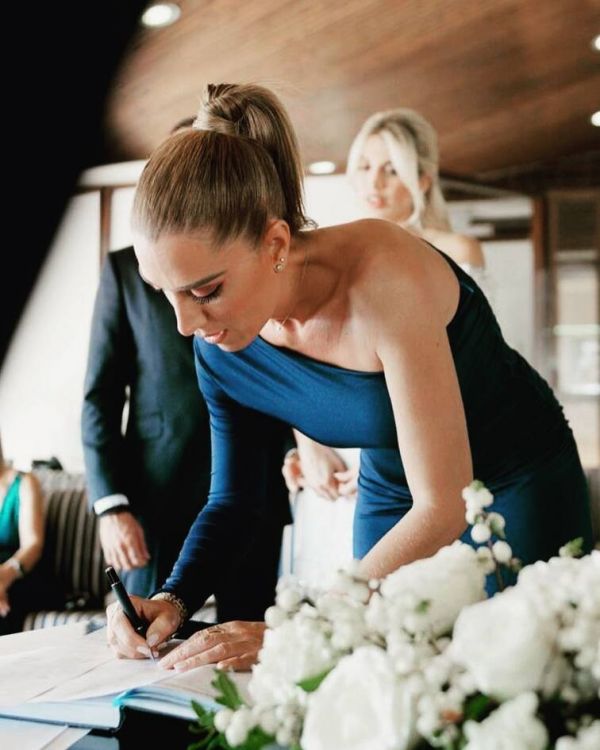 Ο γνωστός επιχειρηματίας επέλεξε για αυτή τη στιγμή ένα μαύρο κοστούμι, ενώ εκείνοι που υπέγραψαν ήταν ο πατέρας του γαμπρού και μια φίλη τους, η οποία προέρχεται από τον χώρο της εστίασης.