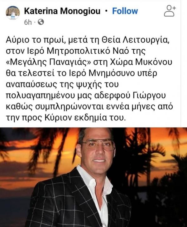 Η ανακοίνωση: "Το πρωί της Κυριακής 9 Οκτωβρίου 2022 στον Ιερό Μητροπολιτικό Ναό της Μεγάλης Παναγιάς στη Χώρα Μυκόνου, θα τελεστεί Θεία Λειτουργία και το Ιερό Μνημόσυνο υπέρ αναπαύσεως της ψυχής του πολυαγαπημένου μας αδερφού, Γιώργου, καθώς συμπληρώνονται 9 μήνες από την προς Κύριον εκδημία του".
