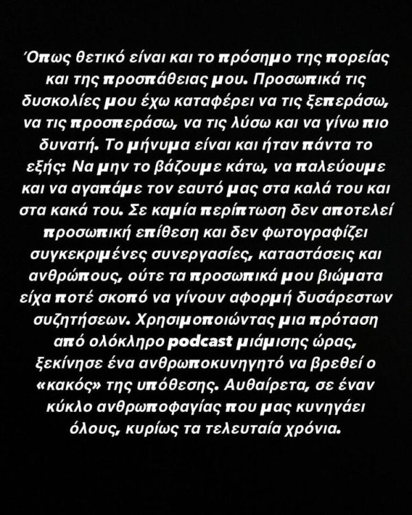 Όπως θετικό είναι και το πρόσημο της πορείας και της προσπάθειάς μου. προσωπικά τις δυσκολίες μου έχω καταφέρει να τις ξεπεράσω να τις προσπεράσω, να τις λύσω και αν γίνω πιο δυνατή. Το μήνυμα είναι και ήταν πάντα το εξής. Να μην το βάζουμε κάτω, να παλεύουμε και να αγαπάμε τον εαυτό μας στα καλά του και τα κακά του. Σε καμία περίπτωση δεν αποτελεί προσωπική επίθεση και δεν φωτογραφίζει συγκεκριμένες συνεργασίες, καταστάσεις και ανθρώπους, ούτε τα προσωπικά μου βιώματα είχα ποτέ σκοπό να γίνουν αφορμή δυσάρεστων συζητήσεων. Χρησιμοποιώντας μια πρόταση από ολόκληρο pοdcast μιάμισης ώρας ξεκίνησε ένα ανθρωποκυνηγητό να βρεθεί ο κακός της υπόθεσης. Αυθαίρετα, σε έναν κύκλο ανθρωποφαγίας που μας κυνηγάει όλους, κυρίως τα τελευταία χρόνια. Δε συμμετέχω εγώ σε αυτό, δεν έχω εκδικητική φύση και δεν έχω κανένα απωθημένο.
