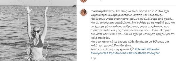 Η Μαρία Μπεκατώρου από την άλλη μοιράστηκε μια φωτογραφία από τις καλοκαιρινές της διακοπές κι έγραψε: «Και πως να είναι άραγε το 2023;Να έχει χαρά,ανεμελιά,χαμόγελο,πολλή αγάπη και καλοσύνη…