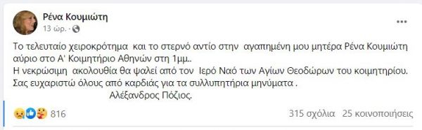 «Το τελευταίο χειροκρότημα και το στερνό αντίο στην αγαπημένη μου μητέρα Ρένα Κουμιώτη στο Α’ Κοιμητήριο Αθηνών στη 1μμ.. Η νεκρώσιμη ακολουθία θα ψαλεί από τον Ιερό Ναό των Αγίων Θεοδώρων του κοιμητηρίου. Σας ευχαριστώ όλους από καρδιάς για τα συλλυπητήρια μηνύματα . Αλέξανδρος Πόζιος» ήταν το μήνυμα που ανέβηκε στον λογαριασμό της Ρένας Κουμιώτη.