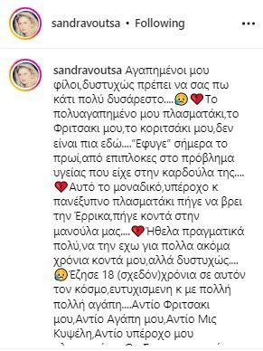 «Αγαπημένοι μου φίλοι, δυστυχώς πρέπει να σας πω κάτι πολύ δυσάρεστο... 😥💔Το πολυαγαπημένο μου πλασματάκι, το Φριτσακι μου, το κοριτσάκι μου, δεν είναι πια εδώ.... ”Εφυγε” σήμερα το πρωί, από επιπλοκες στο πρόβλημα υγείας που είχε στην καρδούλα της....💔