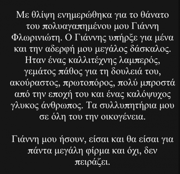 «Με θλίψη ενημερώθηκα για τον θάνατο του πολυαγαπημένου μου Γιάννη Φλωρινιώτη. Ο Γιάννης υπήρξε για μένα και την αδερφή μου μεγάλος δάσκαλος. Ήταν ένας καλλιτέχνης λαμπερός, γεμάτος πάθος για τη δουλειά του, ακούραστος, πρωτοπόρος, πολύ μπροστά από την εποχή του και ένας καλόψυχος, γλυκός άνθρωπος.