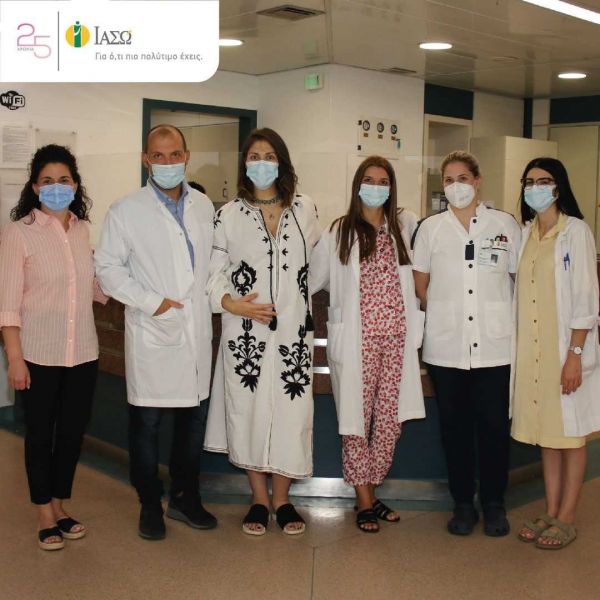 Με το μωράκι της, τον γιατρό της και τις μαίες της την ημέρα που έγινε μανούλα.