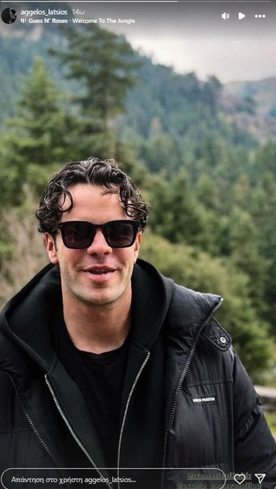 Ο Άγγελος Λάτσιος ποζάρει στον φακό χαμογελαστός με ένα μαύρο σύνολο και μαύρα γυαλιά ηλίου και τη φωτογραφία του από εξόρμησή του στην εξοχή, τη συνόδευσε με το τραγούδι των Guns N' Roses "Welcome To the Jungle". Ενώ στη δεύτερη φωτογραφία απεικονίζεται το χιονισμένο τοπίο χωρίς να διευκρινίζει που βρίσκεται.