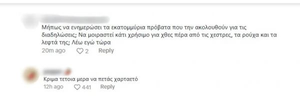 «Μήπως να ενημερώσει τα εκατομμύρια πρόβατα που την ακολουθούν για τις διαδηλώσεις; Να μοιραστεί και κάτι χρήσιμο πέρα από τις χέστρες;», αναφέρει ένας χρήστης.