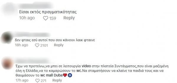 Και ένας άλλος της έγραψε: «Έχω να προτείνω να μπει σε λειτουργία βίντεο στον πλατεία Συντάγματος, που είναι μαζεμένη όλη η Ελλάδα, να το καμαρώσουν το wc. Να σταματήσουν να κλαίνε τα παιδιά τους και να θαυμάσουν το wc του mall στο Dubai».