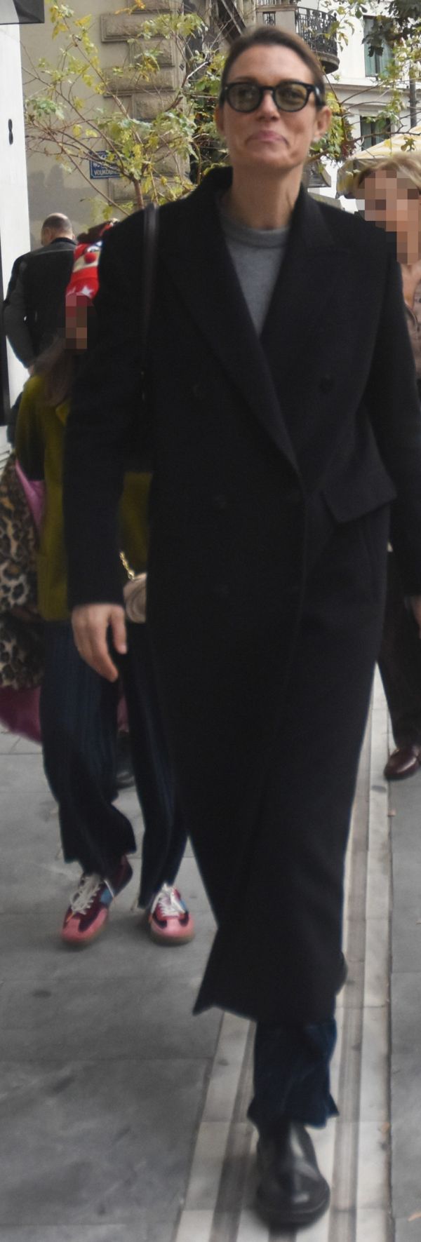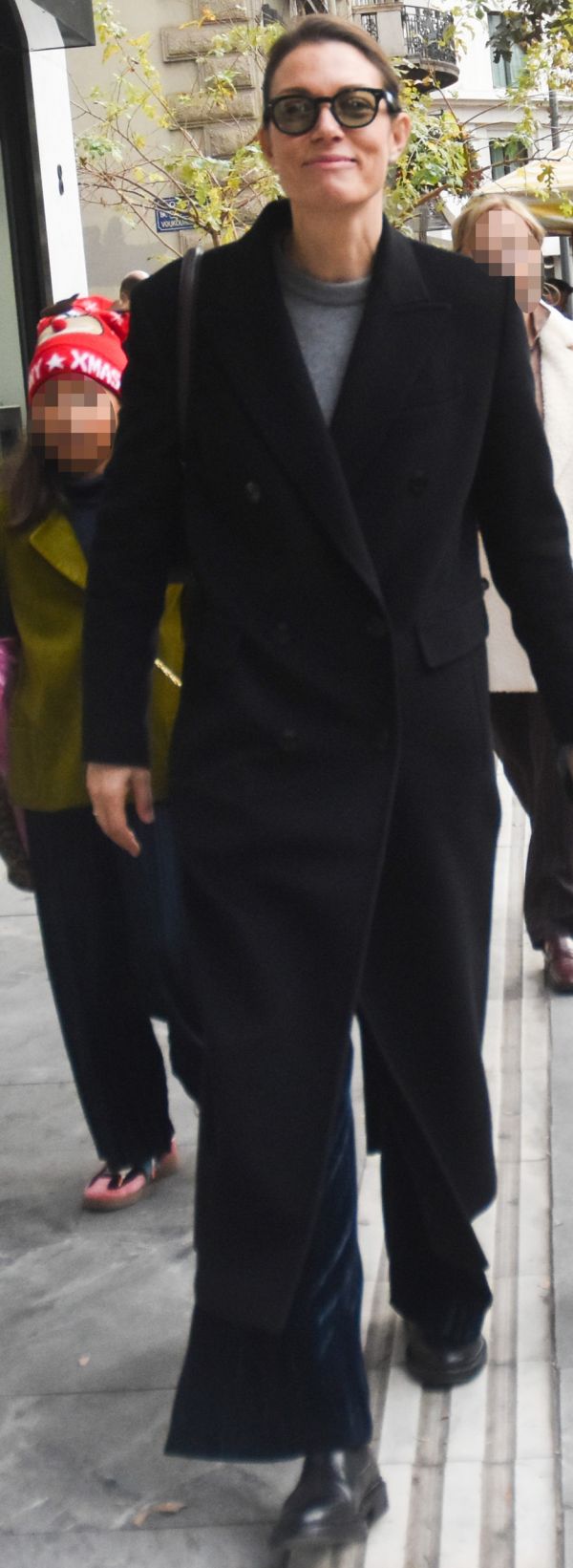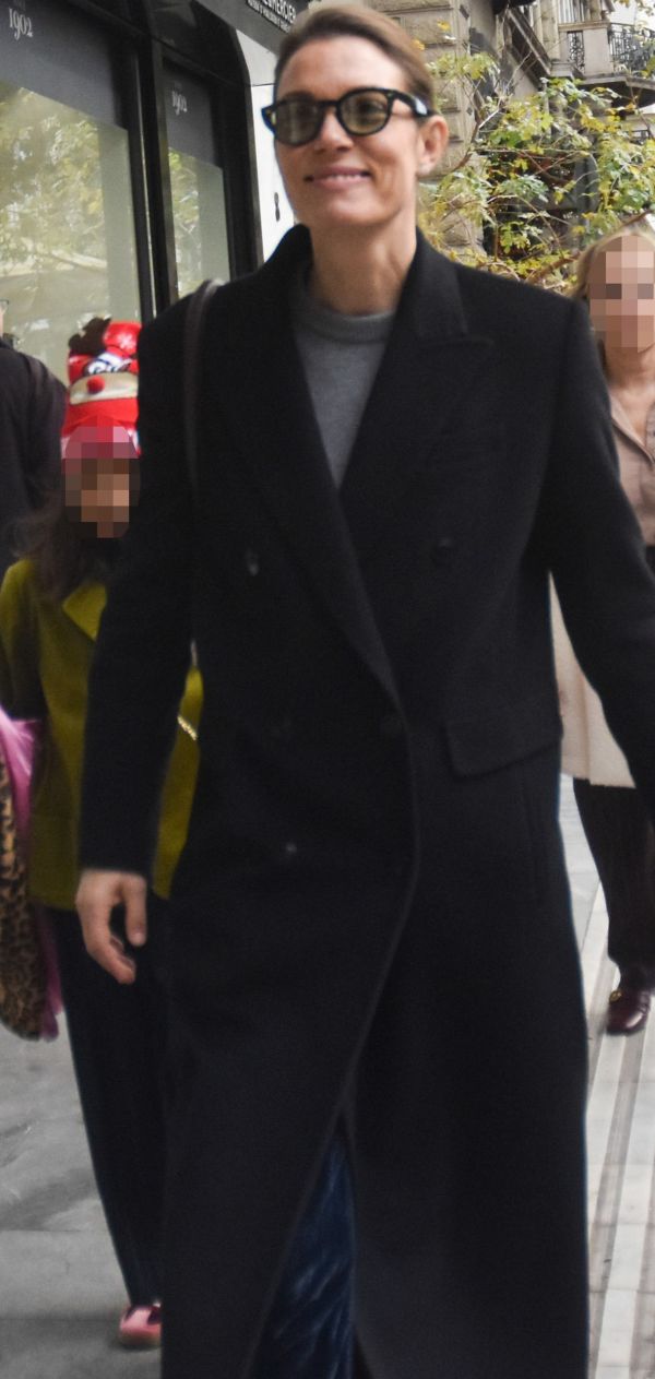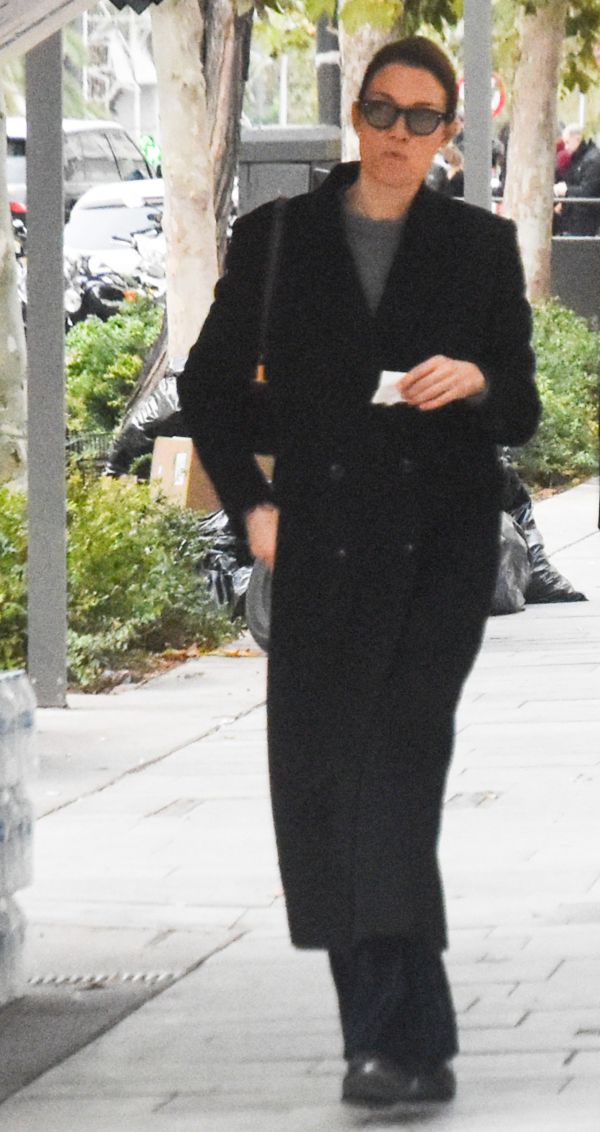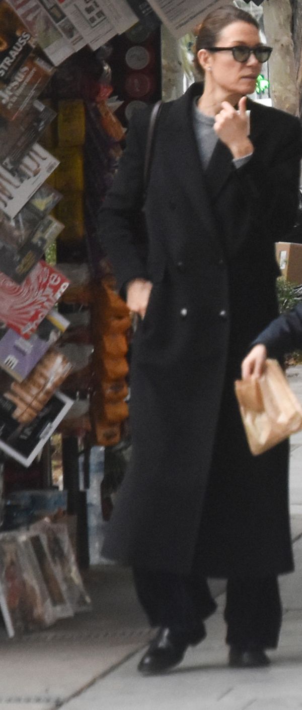 Μαύρο υφασμάτινο παντελόνι, συνδυασμένο με λεπτό που πουλόβερ σε light γκρι απόχρωση και ένα μάξι μαύρο παλτό. Αυτό δε που μας εντυπωσίασε ακόμη περισσότερο σε αυτή την εμφάνισή της είναι το no make up πρόσωπό της.