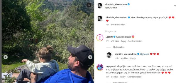 Και μπορεί ο Πάρης να βρίσκεται αυτές τις μέρες στη Θεσσαλονίκη μαζί με τη μαμά του, όμως ο μπαμπάς του αναπολεί τις μέρες που ήταν μαζί και έγραψε χαρακτηριστικά: «Μια ολοκληρωμένη μέρα χαράς !!!» Με την Ιωάννα Τούνη να γράφει: «Αγοράκια μου». Και ο Δημήτρης να της απαντά με τρεις κόκκινες καρδιές δείχνοντας και δημόσια πως μπορεί να έχουν χωρίσει, όμως διατηρούν άριστες σχέσεις για τον μονάκριβο γιο τους.