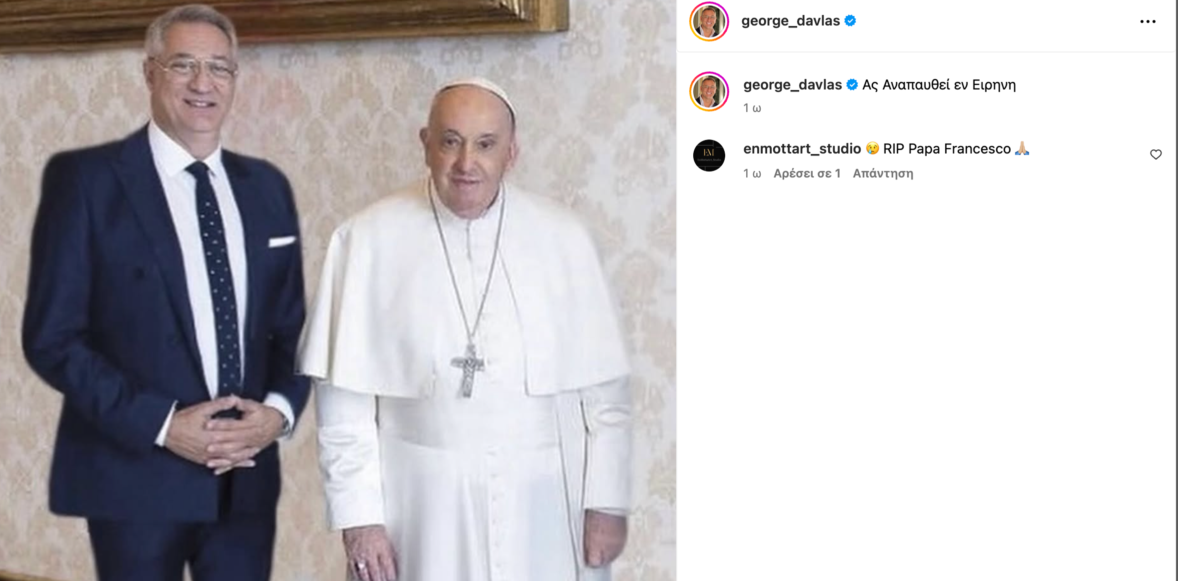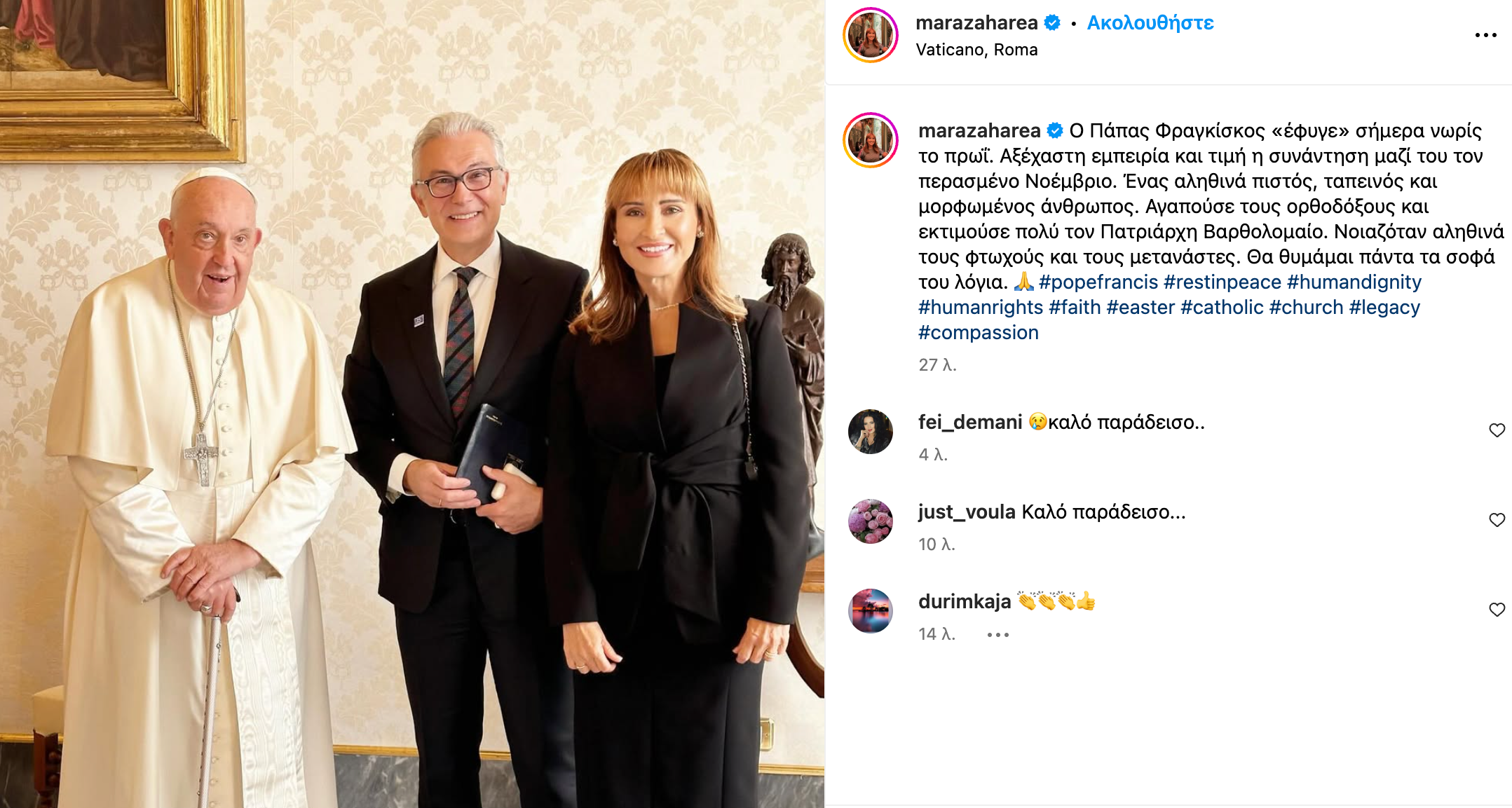 “Ο Πάπας Φραγκίσκος «έφυγε» σήμερα νωρίς το πρωί. Αξέχαστη εμπειρία και τιμή η συνάντηση μαζί του τον περασμένο Νοέμβριο. Ένας αληθινά πιστός, ταπεινός και μορφωμένος άνθρωπος. Αγαπούσε τους ορθοδόξους και εκτιμούσε πολύ τον Πατριάρχη Βαρθολομαίο. Νοιαζόταν αληθινά τους φτωχούς και τους μετανάστες. Θα θυμάμαι πάντα τα σοφά του λόγια. 🙏 », έγραψε η Μάρα Ζαχαρέα.