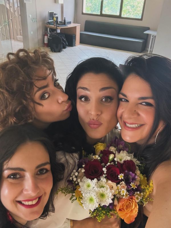 Η νύφη μαζί με τη Μέλια Κράιλινγκ και αρκετές ακόμα φίλες της.