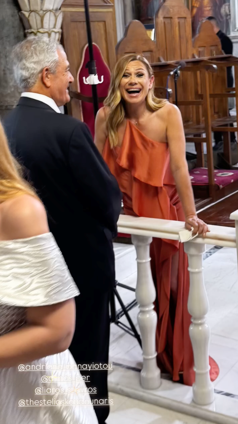 Η Κατερίνα Καραβάτου επέλεξε για την περίσταση να φορέσει ένα εντυπωσιακό τερακότα φόρεμα δια χειρός του Στέλιου Κουδουνάρη, το οποίο συνδύασε με metallic πέδιλα.