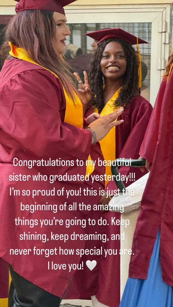 «Συγχαρητήρια στην όμορφη αδελφή μου που αποφοίτησε χθες!!! Είμαι τόσο περήφανη για σένα! Αυτό είναι μόνο η αρχή από όλα τα υπέροχα πράγματα που πρόκειται να κάνεις. Συνέχισε να λάμπεις, να ονειρεύεσαι και μην ξεχνάς ποτέ πόσο ξεχωριστή είσαι. Σ’ αγαπώ!», έγραψε σε μια από τις αναρτήσεις της η Μαρίνα Σάττι για την αδελφή της και πόσταρε στιγμιότυπα από την ανάρτησή της.