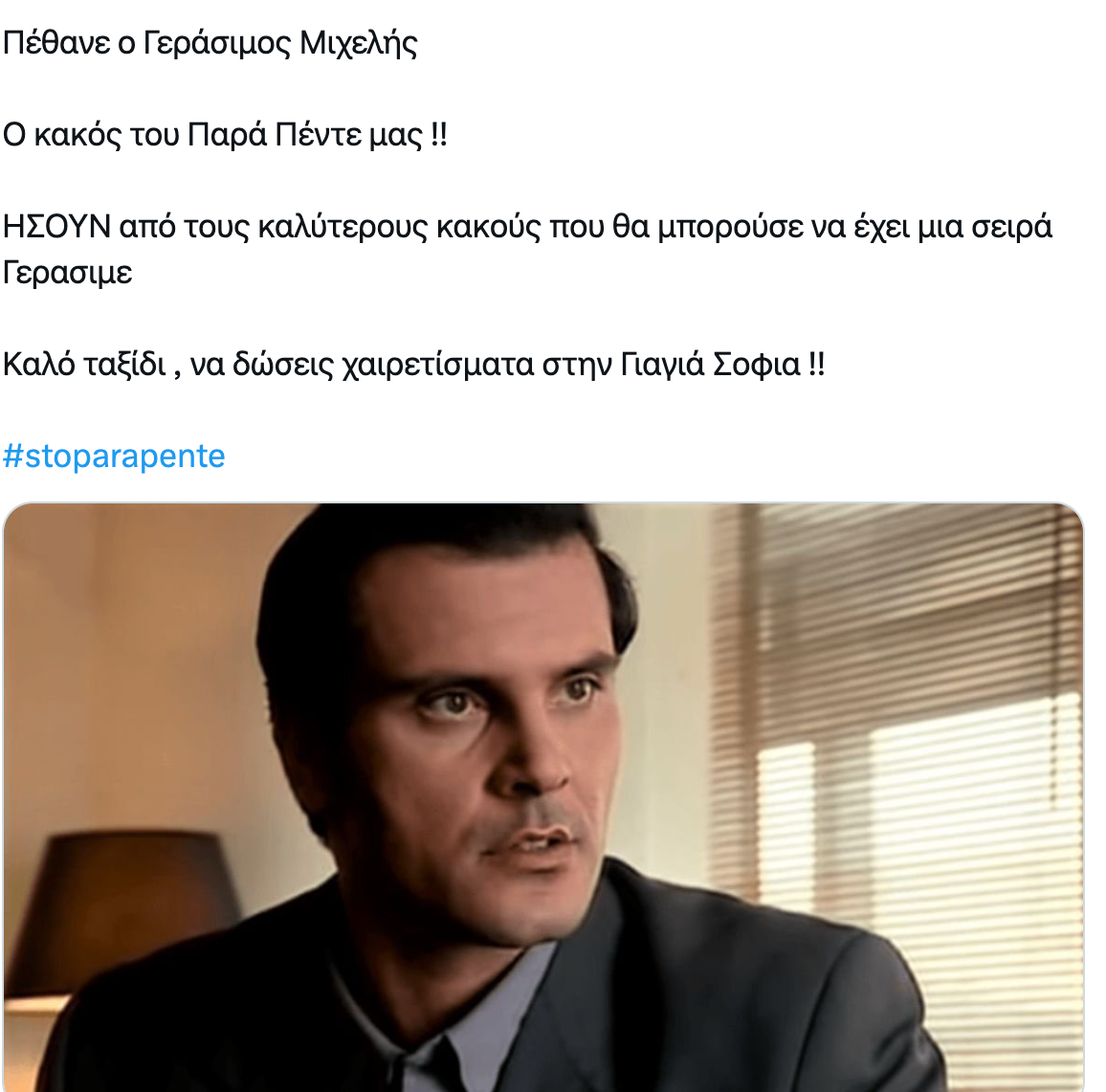 Η είδηση του θανάτου του αγαπημένου κακού της σειράς Στο Παρά Πέντε, έπεσε σαν κεραυνός εν αιθρία σήμερα. Οι τηλεθεατές που τον αγάπησαν όλα αυτά τα χρόνια, θέλησαν να τον αποχαιρετήσουν με μηνύματα στα social media.