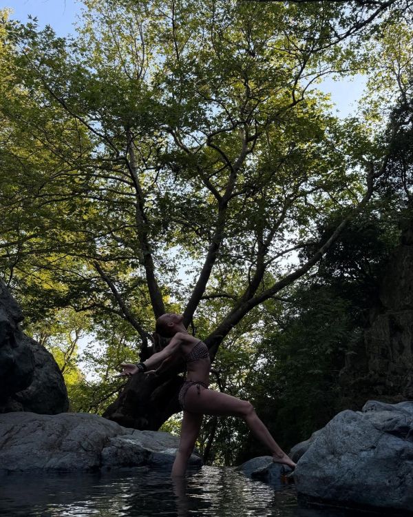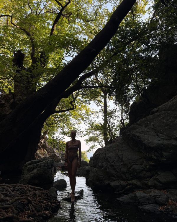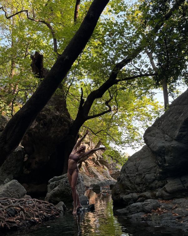 Σε μια σειρά από φωτογραφίες που κόβουν την ανάσα, η ηθοποιός ποζάρει μέσα σε ένα καταπράσινο τοπίο, με φόντο δέντρα και ποτάμι, φορώντας μόνο το μπικίνι της.