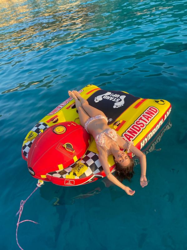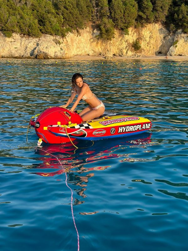 Η ηθοποιός φορώντας ένα floral μαγιό και καθισμένη ή όρθια πάνω στο πολύχρωμο φουσκωτό «Hydroplane» περνά ξέγνοιαστες στιγμές και χαίρεται το γαλάζιο της θάλασσας και τον ήλιο.