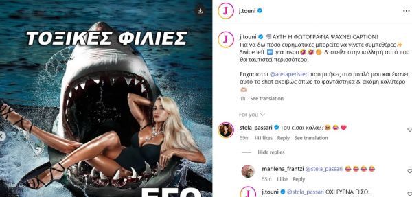 Η Ιωάννα Τούνη δημοσίευσε μία φωτογράφηση που έκανε και βρίσκεται μέσα σε σαγόνια καρχαρία, προφανώς μετά από επεξεργασία που έγινε και ανεβάζοντας την ίδια φωτογραφία πολλές φορές πέταξε τις δικές της σπόντες γράφοντας: «Τοξικοί γκόμενοι», «Η ζωή μου καίγεται», «Hate comments στα social», «Ο λογαριασμός ρεύματος», «Red flags», «Μη γίνεσαι drama queen», «Τοξικές φιλίες» και σε όλα αυτά… «Εγώ».