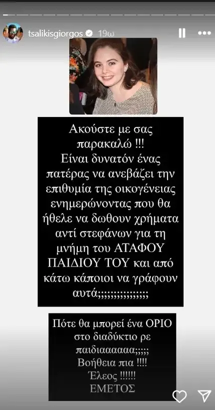 «Ακούστε με σας παρακαλώ. Είναι δυνατόν ένας πατέρας να ανεβάζει την επιθυμία της οικογένειας ενημερώνοντας που θα ήθελε να δοθούν χρήματα αντί στεφάνων για τη μνήμη του ΑΤΑΦΟΥ ΠΑΙΔΙΟΥ ΤΟΥ και από κάτω κάποιοι να γράφουν αυτά;».