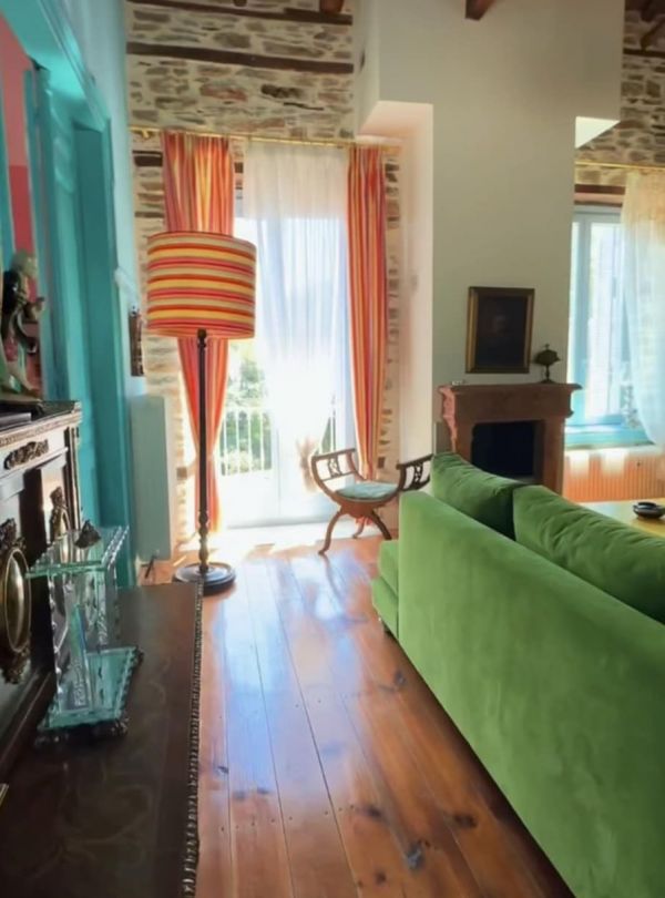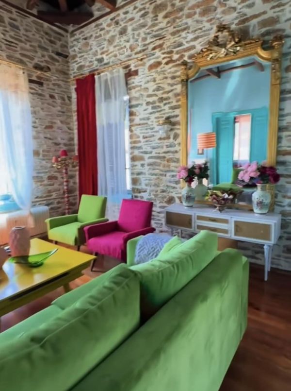 Μέσα στο σπίτι υπάρχει πέτρα σε διάφορα σημεία και ξεχωρίζει μια μια γαλάζια ξύλινη σκάλα κι ένας πράσινος βελούδινος καναπές.