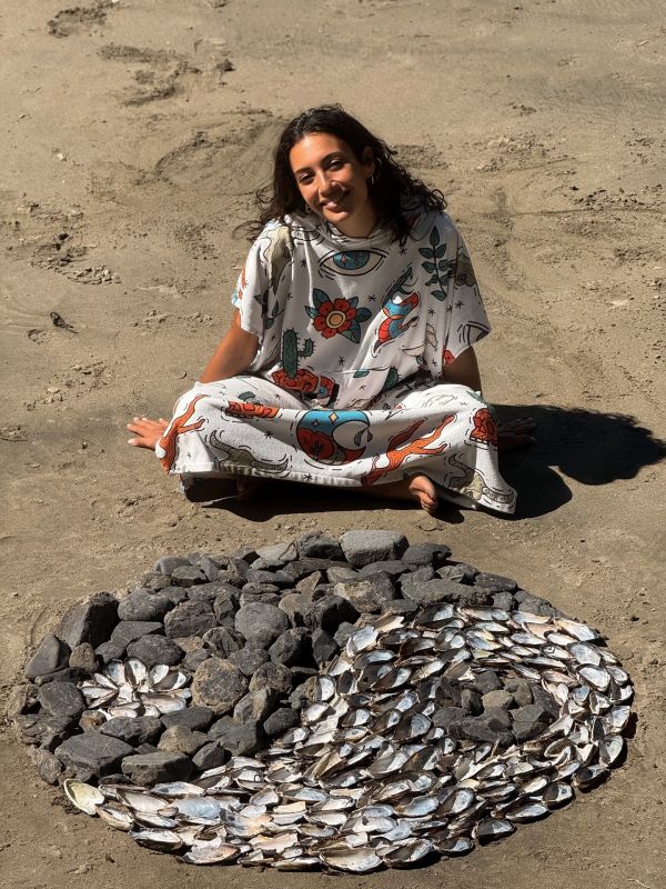 Σε αυτή τη φυσική ομορφιά, βρήκε και κάτι πιο βαθύ, επηρεασμένη από τη σοφία των πρώτων φυλών της περιοχής, εμπνεύστηκε από τη λέξη "Cawakniš", που σημαίνει «είμαστε όλοι ένα». Ένα μήνυμα ενότητας και σύνδεσης με τη φύση, που αποτύπωσε συμβολικά στην άμμο με μια δημιουργία από πέτρα και κοχύλι.
