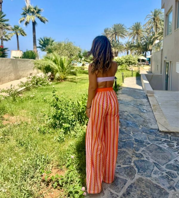 Σε πρόσφατη ανάρτησή της, ποζάρει χαμογελαστή και ανέμελη, ντυμένη με ένα κομψό λευκό strapless μαγιό, το οποίο συνδυάζει με πλεκτό παντελόνι – ένα από τα πιο hot fashion trends του φετινού καλοκαιριού. Το outfit της αποπνέει αέρα νησιώτικης απλότητας, αναδεικνύοντας ταυτόχρονα τη θηλυκή της πλευρά με φυσικότητα και κομψότητα.