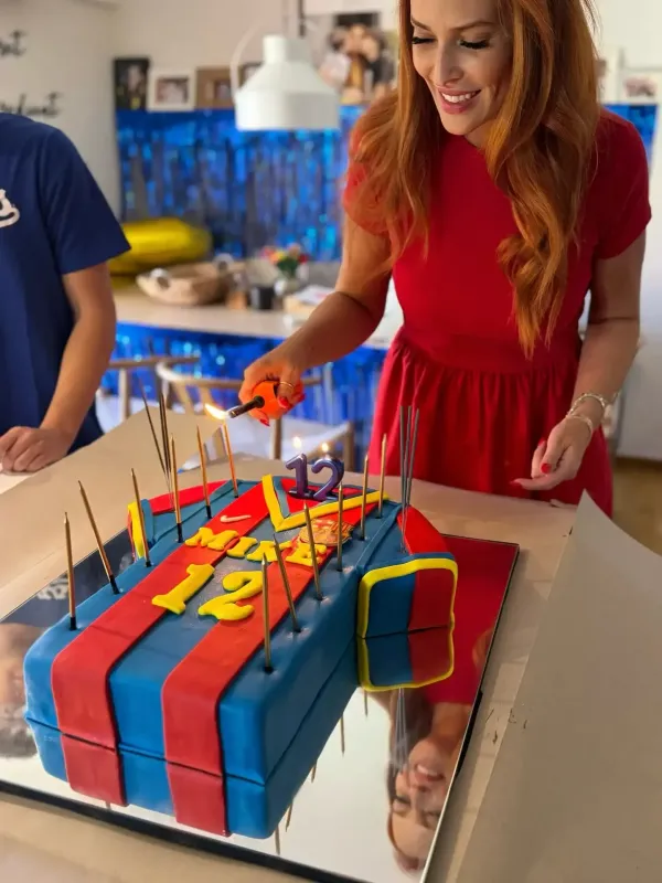 Η παρουσιάστρια μοιράστηκε με τους διαδικτυακούς της φίλους στο Instagram τρυφερές εικόνες από τη μικρή γιορτή που ετοίμασε στο σπίτι, όπου παρευρέθηκαν αγαπημένοι φίλοι του γιου της. Ξεχωριστή λεπτομέρεια ήταν η τούρτα, που είχε σχήμα φανέλας της Μπαρτσελόνα, αφού ο Μιχαήλ-Άγγελος λατρεύει το ποδόσφαιρο.