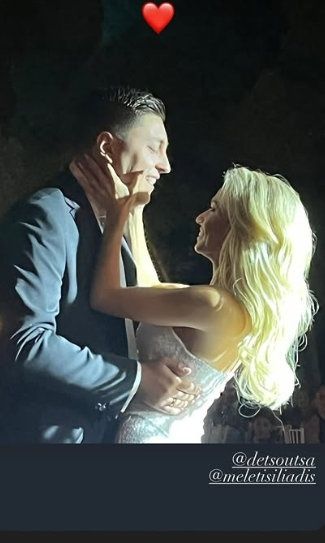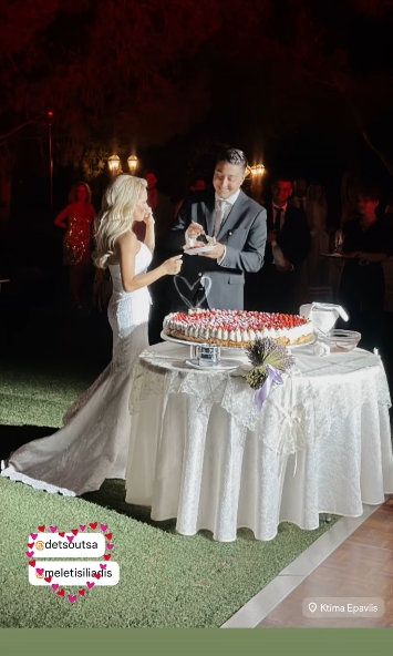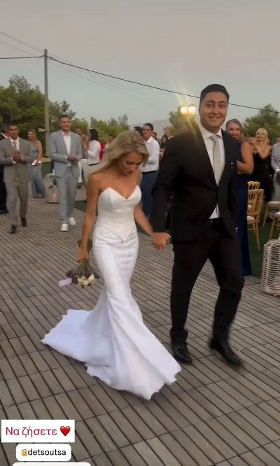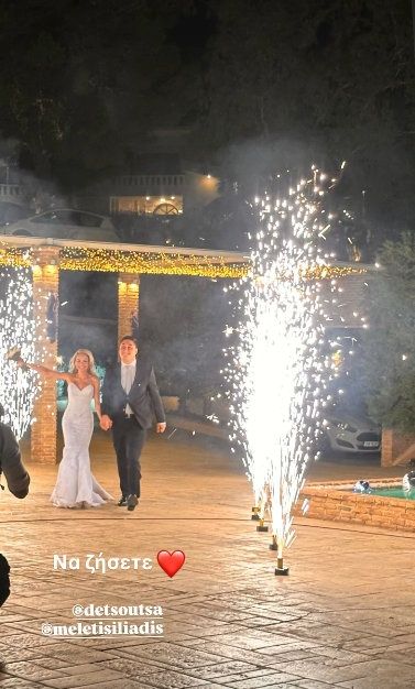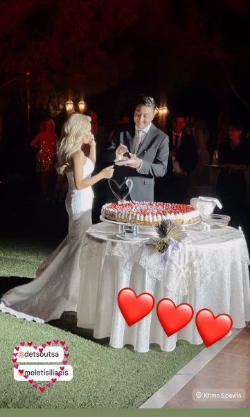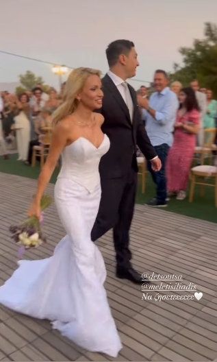 Η πιο συγκινητική στιγμή της βραδιάς ήταν όταν οι νεόνυμφοι χόρεψαν για πρώτη φορά ως ανδρόγυνο, αγκαλιασμένοι υπό τους ήχους του τραγουδιού «Όλες του κόσμου οι Κυριακές», με τη μοναδική φωνή της Χαρούλας Αλεξίου να ντύνει μουσικά το ξεκίνημα της κοινής τους ζωής.