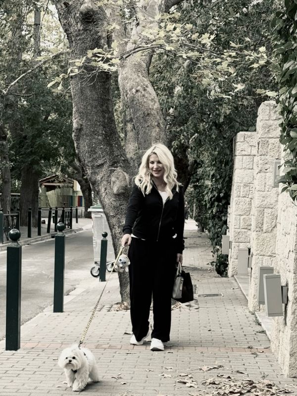 Η Ελένη Μενεγάκη αμακιγιάριστη και φορώντας τις φόρμες της κάνει βόλτα στην Κηφισιά με τον τετράποδο φίλο της.