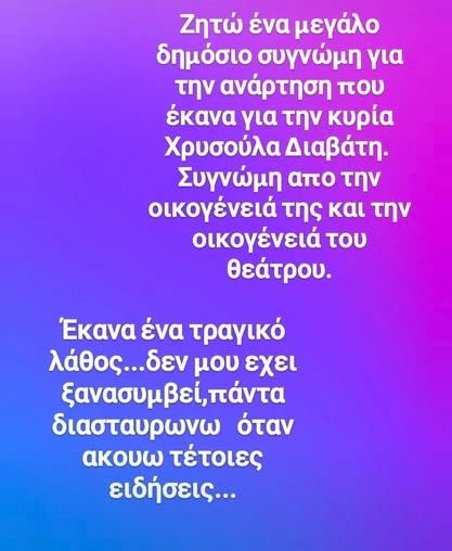Η Καίτη Φίνου αφού κατάλαβε το λάθος της, έκανε νέα ανάρτηση και ζήτησε δημόσια συγγνώμη: «Ζητώ ένα μεγάλο δημόσιο συγγνώμη για την ανάρτηση που έκανα για την κυρία Χρυσούλα Διαβάτη. Συγγνώμη από την οικογένειά της και την οικογένεια του θεάτρου. Έκανα ένα τραγικό λάθος… δεν μου έχει ξανασυμβεί, πάντα διασταυρώνω όταν ακούω τέτοιες ειδήσεις».