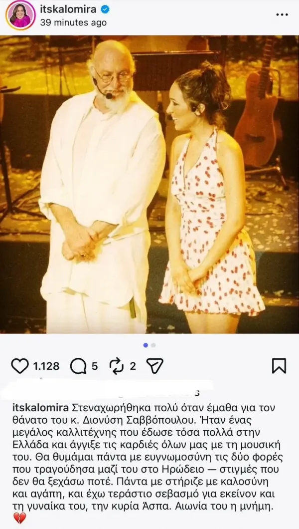 Η Καλομοίρα ανέβασε μια κοινή φωτογραφία με τον Διονύση Σαββόπουλο από το Ηρώδειο, εκφράζοντας τη βαθιά της λύπη για τον θάνατό του.
