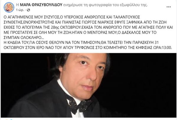 "Ο αγαπημένος μου σύζυγος, ο υπέροχος άνθρωπος και ταλαντούχος συνθέτης, ενορχηστρωτής και πιανίστας Γιώργος Νιάρχος, έφυγε ξαφνικά από τη ζωή εχθές το απόγευμα της 28ης Οκτωβρίου. Έχασα τον άνθρωπο που με αγάπησε πολύ και με προστάτευε σε όλη μου τη ζωή. Ήταν ο μέντοράς μου, ο δάσκαλός μου, το σύμπαν ολόκληρο...