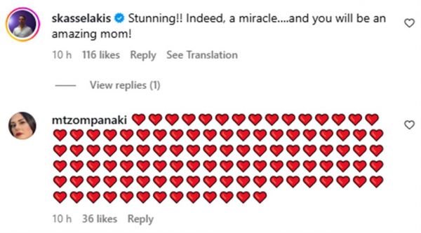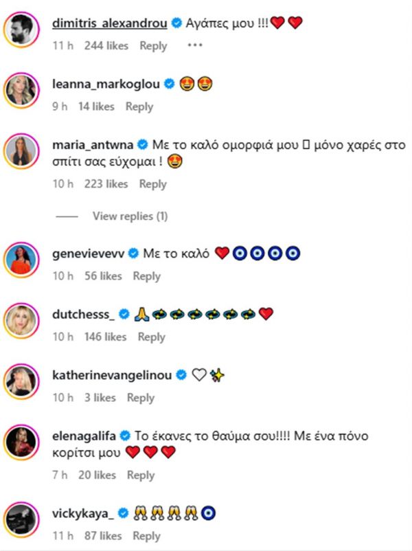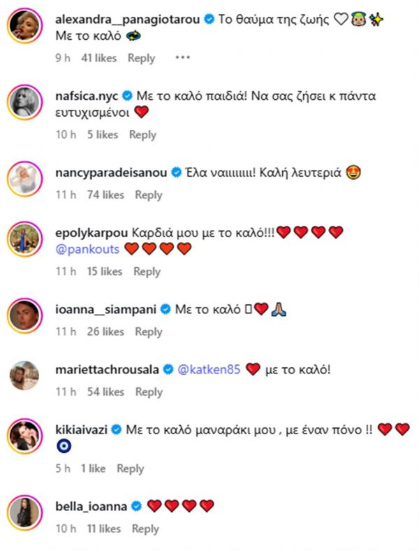 Αμέσως πολλοί celebrities της έστειλαν τις ευχές τους και ανάμεσα τους ήταν, η Βίκυ Καγιά, η Μαρία Τζομπανάκη, ο Δημήτρης Αλεξάνδρου, η Μαριέττα Χρουσαλά, η Καλομοίρα, η Ελένη Χατζίδου και αρκετοί άλλοι.