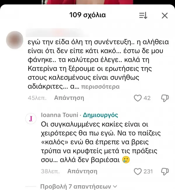 Η γνωστή influencer δεν έμεινε μόνο εκεί αλλά απάντησε σχεδόν σε κάθε σχόλιο κάτω από το βίντεο. Σε ένα από αυτά, όπου κάποιος χρήστης υποστήριζε ότι ο Δημήτρης δεν μίλησε κακοπροαίρετα, εκείνη ανταπάντησε με νόημα:
