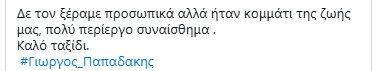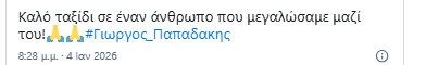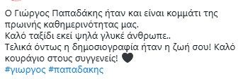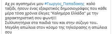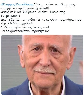 Το κύμα αγάπης μέσα από τα social media είναι πραγματικά συγκινητικό καθώς ακόμα και εκείνοι, ανάμεσα στον απλό κόσμο, που δεν τον γνώριζαν, είχαν μόνο καλά λόγια να πουν για τον Γιώργο Παπαδάκη.