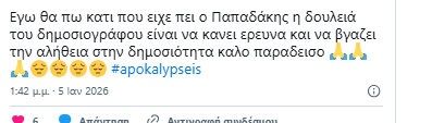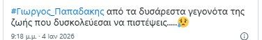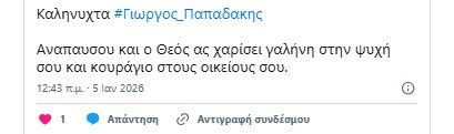 Οι τηλεθεατές του ANT1 εξέφρασαν τη θλίψη τους μέσα από τα social media, για την αιφνίδια απώλεια του Γιώργου Παπαδάκη, στέλνοντας μηνύματα αγάπης και μνήμες από τις στιγμές που τους κράτησε συντροφιά για δεκαετίες.