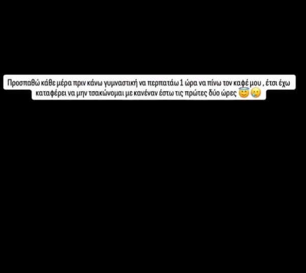 «Προσπαθώ κάθε μέρα, πριν κάνω γυμναστική να περπατάω μία ώρα να πίνω τον καφέ μου. Έτσι έχω καταφέρει να μην τσακώνομαι με κανέναν έστω τις δύο πρώτες ώρες»