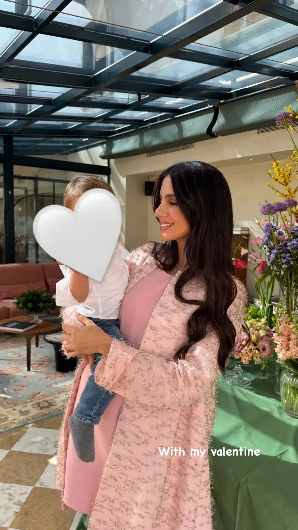 Στη φωτογραφία που ανέβασε στα social media, η σύζυγος του Κωνσταντίνος Αργυρός ποζάρει με εμφανώς φουσκωμένη κοιλίτσα, φορώντας ένα ροζ φόρεμα συνδυασμένο με πανωφόρι στην ίδια χρωματική παλέτα. Στην αγκαλιά της κρατά τον μικρό της γιο, Βασίλη, σε ένα ιδιαίτερα τρυφερό στιγμιότυπο.