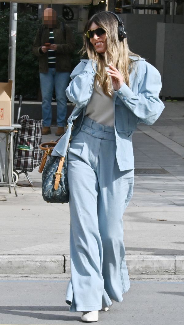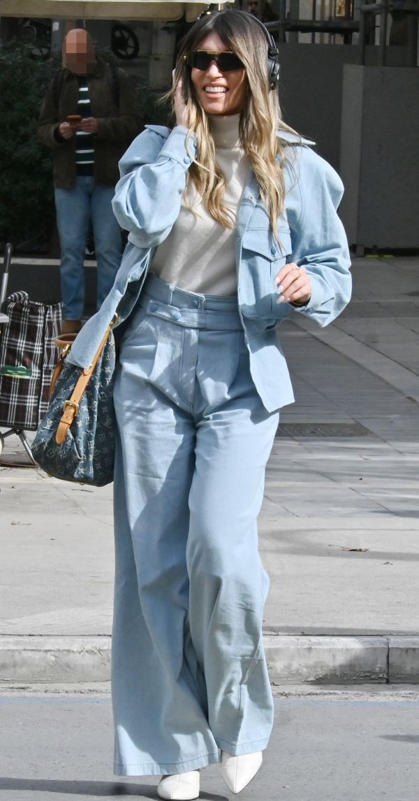Πάντα σικ αλλά με μια διακριτική casual πινελιά, η ηθοποιός επέλεξε ένα κομψό σύνολο σε ανοιξιάτικους τόνους, γαλάζιο υφασμάτινο παντελόνι σε γραμμή wide leg με το αντίστοιχο τζάκετ, το οποίο συνδύασε με λευκό τοπ και λευκά παπούτσια, δημιουργώντας ένα σύγχρονο και άνετο look ιδανικό για τις βόλτες στην πόλη.