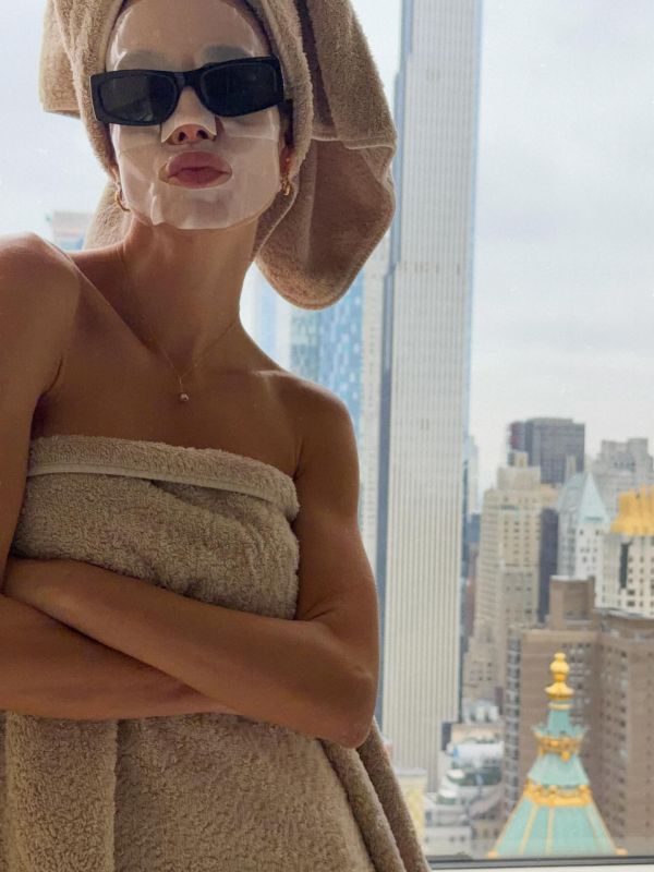 Μέσα από αναρτήσεις στον λογαριασμό της στο Instagram εμφανίζεται σε στιγμές χαλάρωσης στο δωμάτιο του ξενοδοχείου της, χωρίς ίχνος μακιγιάζ και τυλιγμένη με μια πετσέτα.