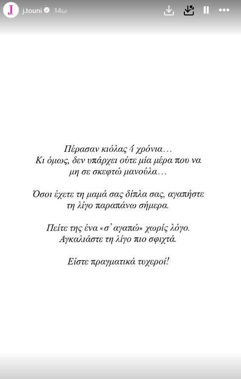Αφού δημοσίευσε μια κοινή τους φωτογραφία, αμέσως μετά έγραψε: «Πέρασαν κιόλας 4 χρόνια… Κι όμως, δεν υπάρχει ούτε μία μέρα που να μη σε σκεφτώ μανούλα… Όσοι έχετε τη μαμά σας δίπλα σας, αγαπήστε τη λίγο παραπάνω σήμερα. Πείτε της ένα "σ’ αγαπώ" χωρίς λόγο. Αγκαλιάστε τη λίγο πιο σφιχτά... Είστε πραγματικά τυχεροί!»