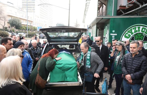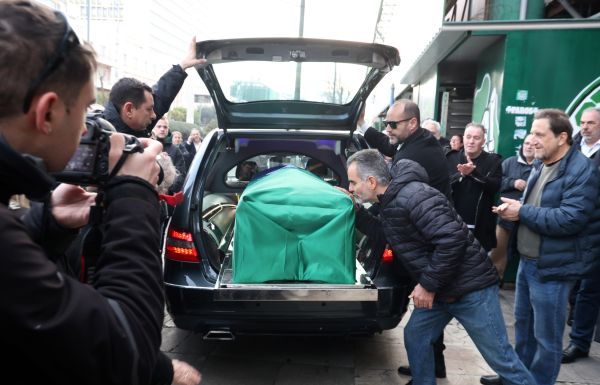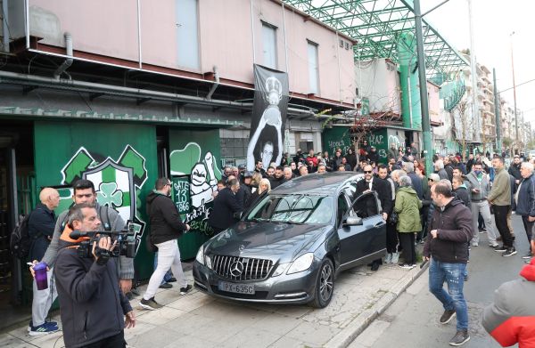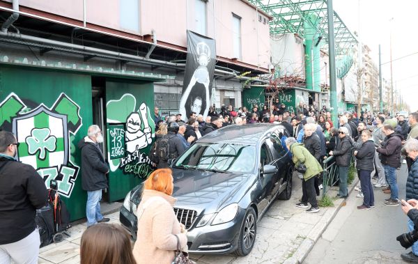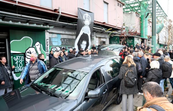 Προτού φτάσει η σορός του Μίμη Δομάζου στη Μητρόπολη στις 09:00, έγινε στάση έξω από το γήπεδο της Λεωφόρου.